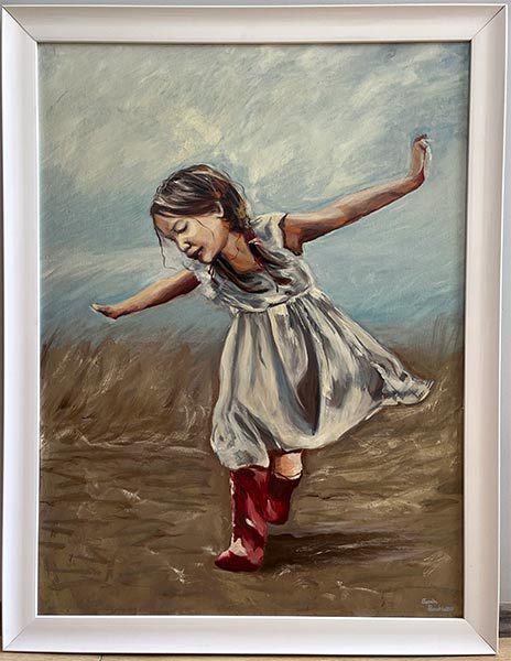 تابلوی «کودک» اثری لطیف و سرشار از انرژی از ثمین پناهی آذر است که معصومیت، آزادی و شادی ناب دوران کودکی را با ضرباهنگی پرشور به تصویر کشیده است. حرکت آزاد دخترک با لباس روشن و چکمههای قرمز، روی بومی از رنگهای خاکی و آسمانی، حسی از رهایی و بیپروایی کودکانه را در ذهن بیننده بیدار میکند. این اثر، یادآور لحظات ناب و بیدغدغهای است که تنها در دنیای کودکانه یافت میشود.
