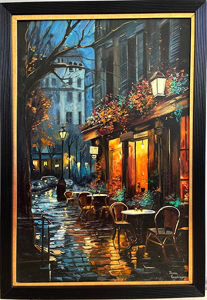 تابلوی «کافه در پاییز» اثری چشمنواز از ثمین پناهی آذر است که با ضرباهنگی شاعرانه، فضای دلنشین یک کافهی گرم در دل کوچهای بارانی را به تصویر کشیده است. انعکاس نور چراغها بر سنگفرش خیس و ترکیب رنگهای درخشان پاییزی با آبی آسمان شبانه، حسی از آرامش، نوستالژی و صمیمیت را در دل بیننده زنده میکند. این اثر، ترکیبی از زندگی شهری و رمانتیسم شاعرانه است که نگاهها را مجذوب میسازد.